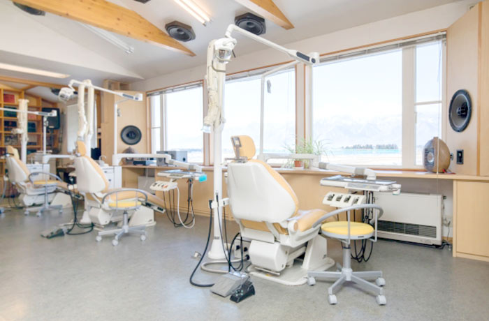 診療室全体を撮影する際は、天井の照明が入るように少し見上げる角度で撮ると、明るく清潔な印象になります。