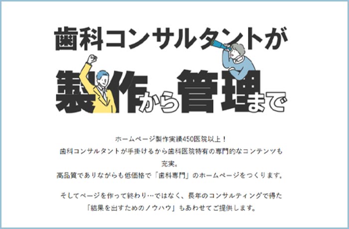 東京歯科経営ラボは、歯科コンサルタントがHP制作のディレクションを担当する歯科専門の制作会社です。制作実績は450医院以上。文章は歯科医師免許保有者などの専門ライターが担当し、プロカメラマンによる院内撮影も標準で含まれています。